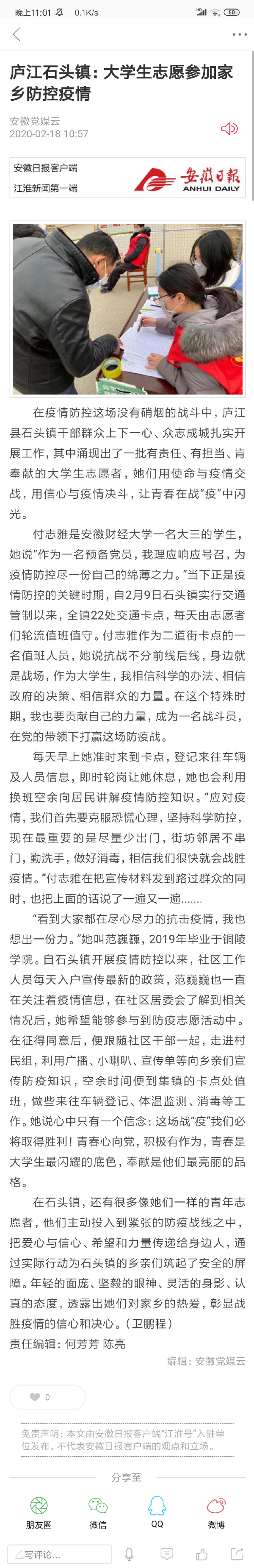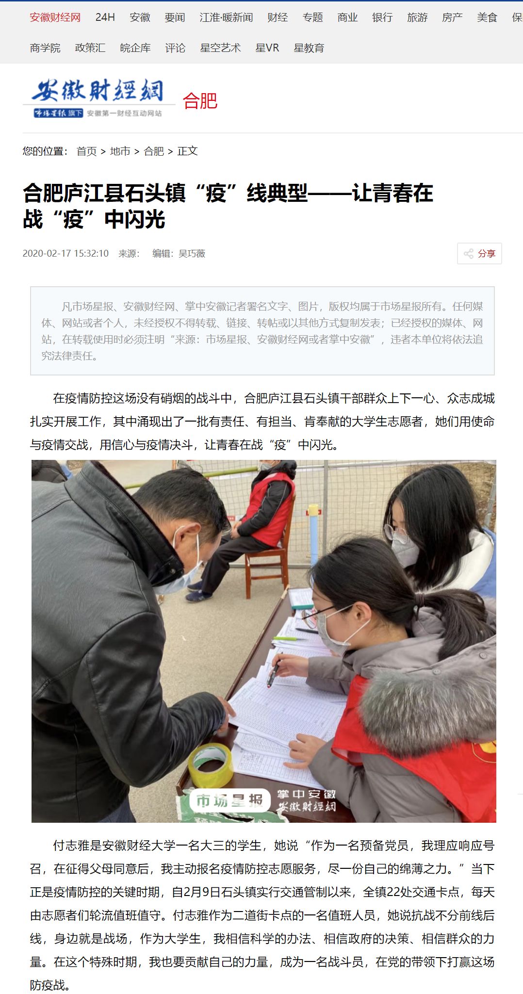 疫情就是命令,防疫就是使命!疫情防控阻击战正值攻坚阶段,我院17级审计1班预备党员付志雅同学,在家乡积极响应党的号召,成为了一名防疫工作志愿者。此外,付志雅同学的事迹还被凤凰网和安徽财经网报道,尽显了会院学子的担当。下面,让我们一起走进付志雅同学的抗疫故事!