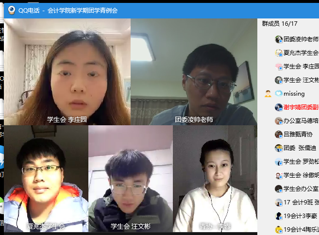 2月23日晚,澳门十大信誉网赌网址排名组织召开2020年团学青第一次线上主题例会,院团学青主要学生干部、团支书代表等近20人线上视频参加,学院团委书记凌帅主持会议。