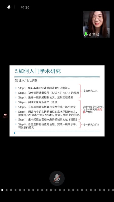 马黎珺从什么是博士学位、读博的收益与成本,及如何进行财务、会计领域的学术研究等层次展开,首先运用生动的介绍了博士学位的意义接着分析了读博的收益与成本,她认为读博的最大收益在于拥有了科学的思维方式,而成本则在于3-4年工作经历带来的交换价值;然后,运用研究选题示例说明了财务会计领域学术研究的目标及其必要性,并认为对学术研究有兴趣、抗压好、悟性强的同学更适合做学术研究;最后,马黎珺详细介绍了入门学术研究的八个步骤和五个重要原则,建议同学们利用好各种学术资源,并多阅读专著以及财务、会计、金融领域的国际、国内的顶级期刊文献
