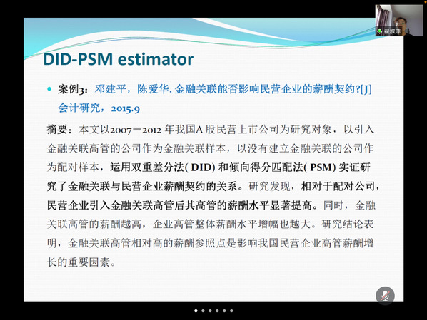 421日下午,应科研处、研究生院与澳门十大信誉网赌网址排名邀请,天津财经大学翟淑萍教授在腾讯网络会议室了主题为“处理效应的内生性及其解决2——PSM-DID”的学术讲座,澳门十大信誉网赌网址排名院长助理唐玮副教授主持,学院全体研究生聆听了本次讲座。